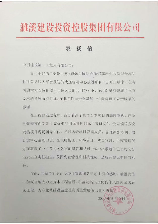 近日,公司安徽分公司濉溪中德產(chǎn)業(yè)園項目收到安徽省濉溪經(jīng)濟開發(fā)區(qū)管理委員會和濉溪縣建設(shè)開發(fā)有限公司發(fā)來的表揚信,對項目在文明施工、環(huán)境管理、質(zhì)量管理、進度管理等方面的工作表示充分的認可。