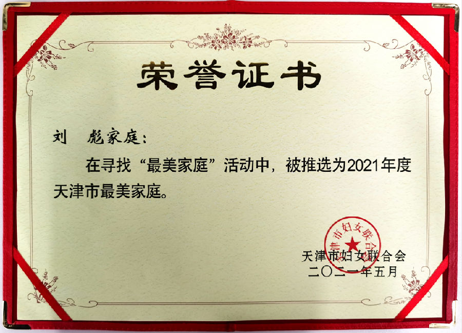 近日,從天津市婦女聯合會傳來喜訊,公司職工劉玉智、劉彪分別獲評2021 年度天津市家庭和睦“最美家庭”、紅色傳承“最美家庭”榮譽稱號,為公司贏得了榮譽。